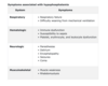 Signs/symptoms: Absence of breath fog, suprasternal and supraclavicular retractions, paradoxical chest and abdomen movements (abdominal breathing), loss of ETCO2/volumes, hypoxia, pink/frothy sputum, bilateral fluffy pulmonary infiltrates on CXR
