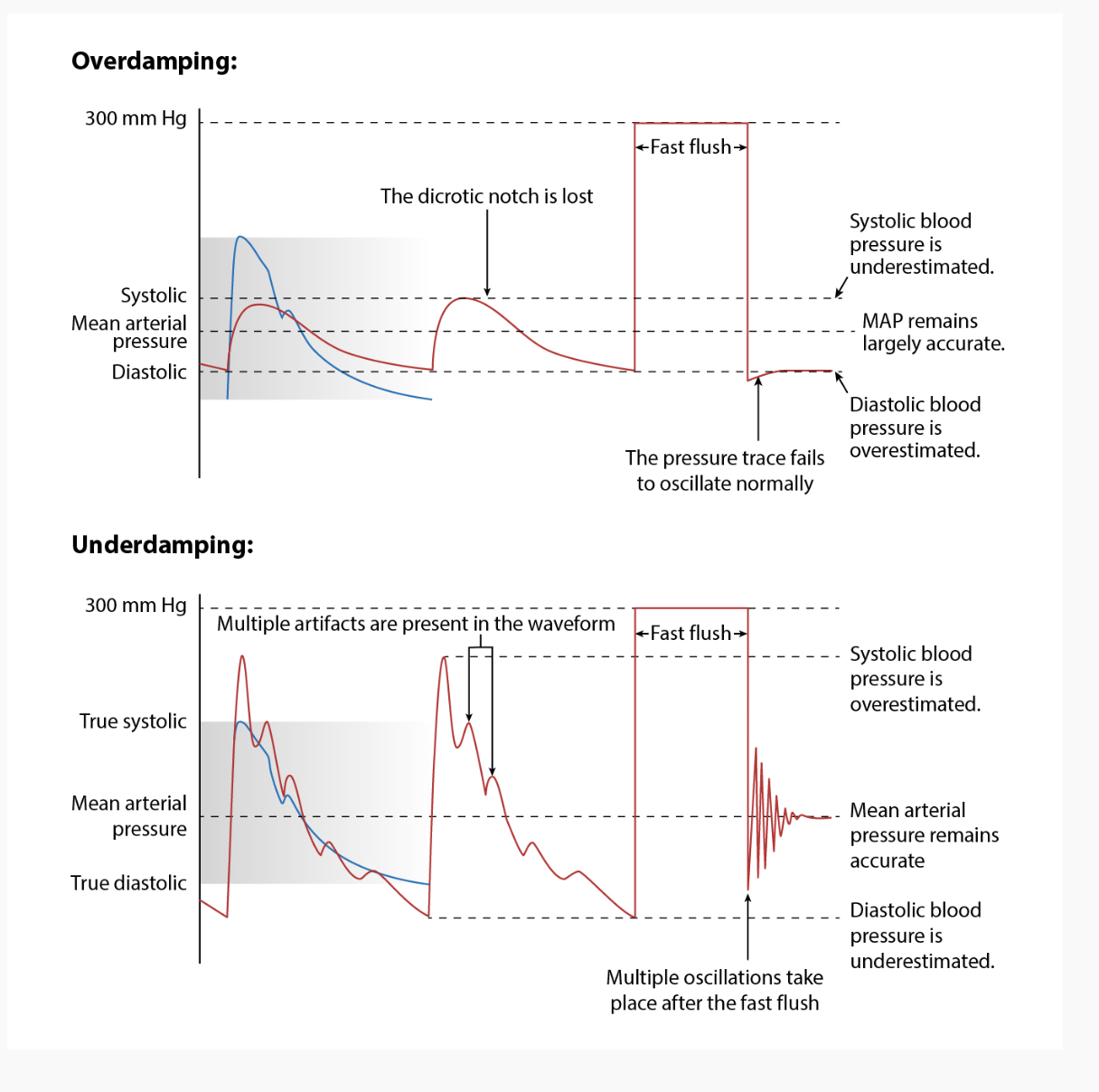 Overdampening is seen on a trace as a loss of dicrotic notch and flattened waveform. Systolic blood pressure will be underestimated. Diastolic pressure will be overestimated. MAP will remain accurate.