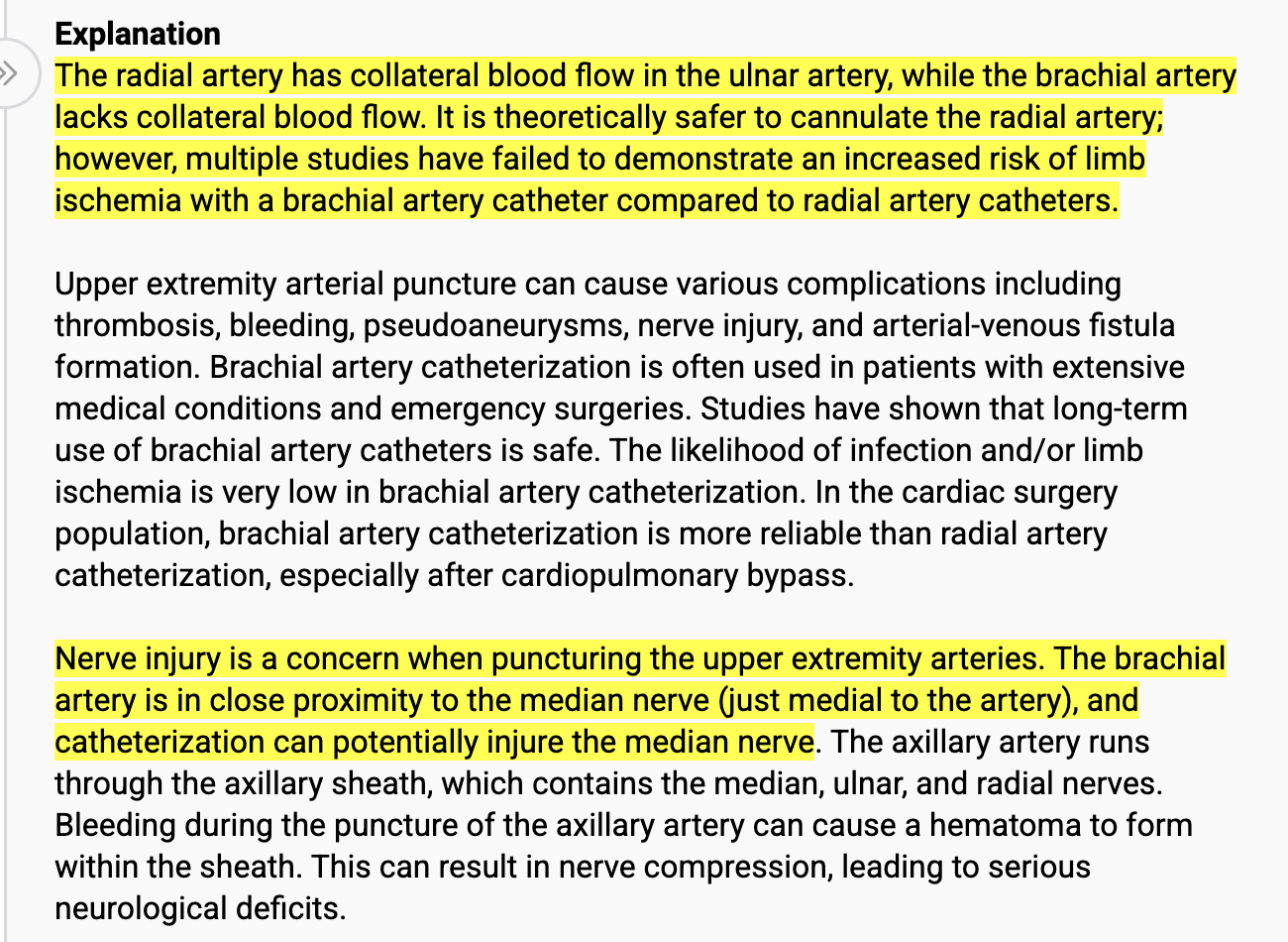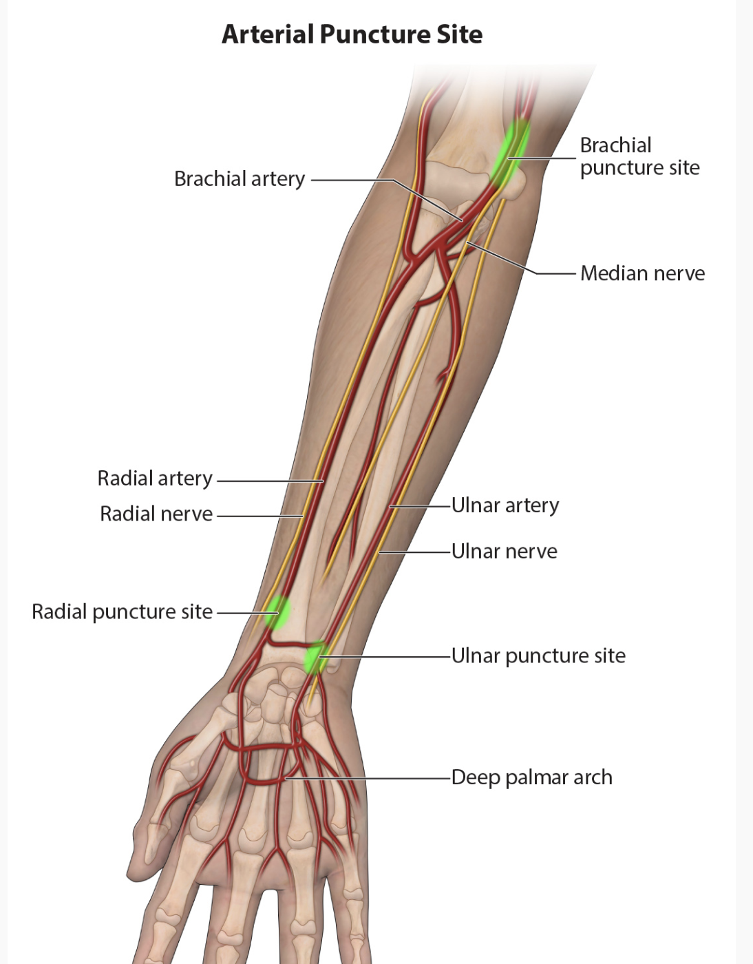 What nerve can potentially be injured by placement of a brachial arterial catheter?