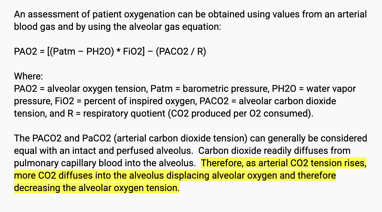Notice that if PaCo2 rises (hypercarbia), PAO2 decreases (less O2 reaching alveoli). This is because the CO2 diffusing into the alveoli displaces the O2 in the alveoli.