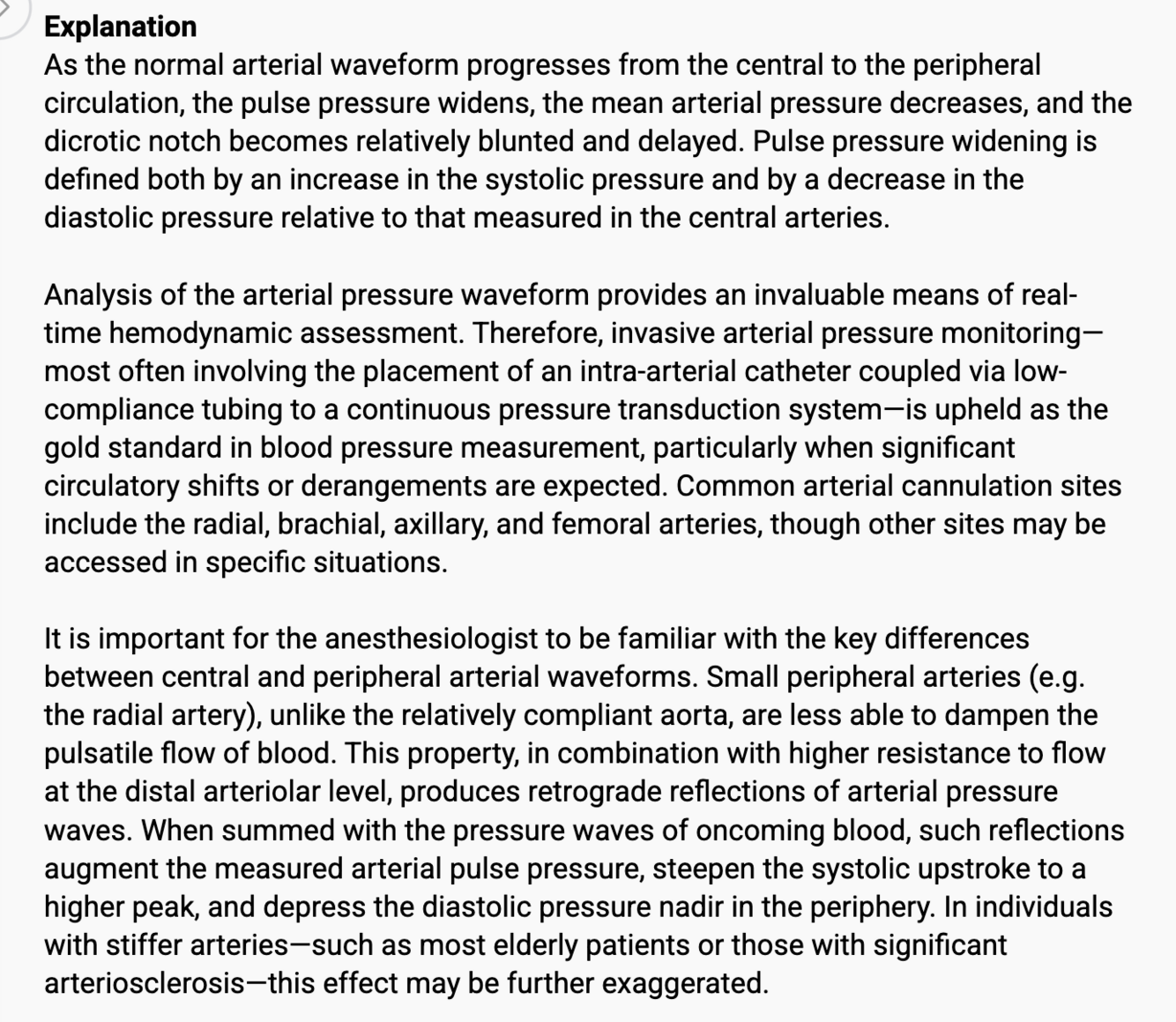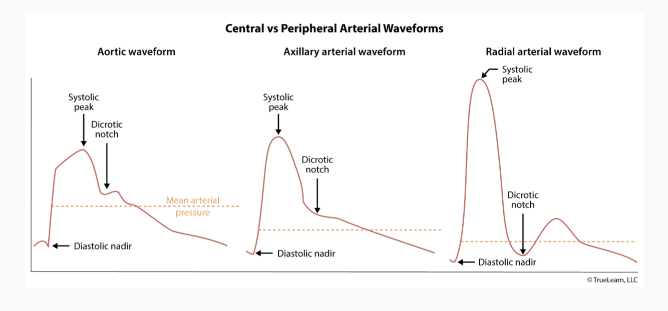 How does a peripheral arterial waveform differ from a central arterial waveform?