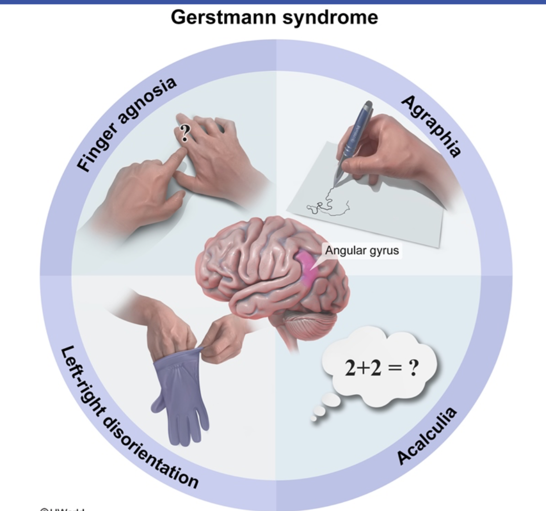 damage to the dominant parietal lobe/angular gyrus manifests as what?