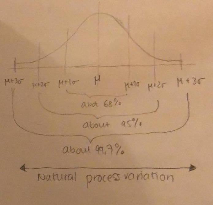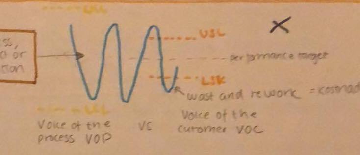 to target in the mittle is the performance target on the left side is the Upper control limit and the lower control limit. these is the voice of the process VOP. the right side is the Upper specific limit and lower spcific limit that is the voice of the customer VOC. if the production its important that the left and right side limits match otherwise their will be waste and rework that çreates cost,