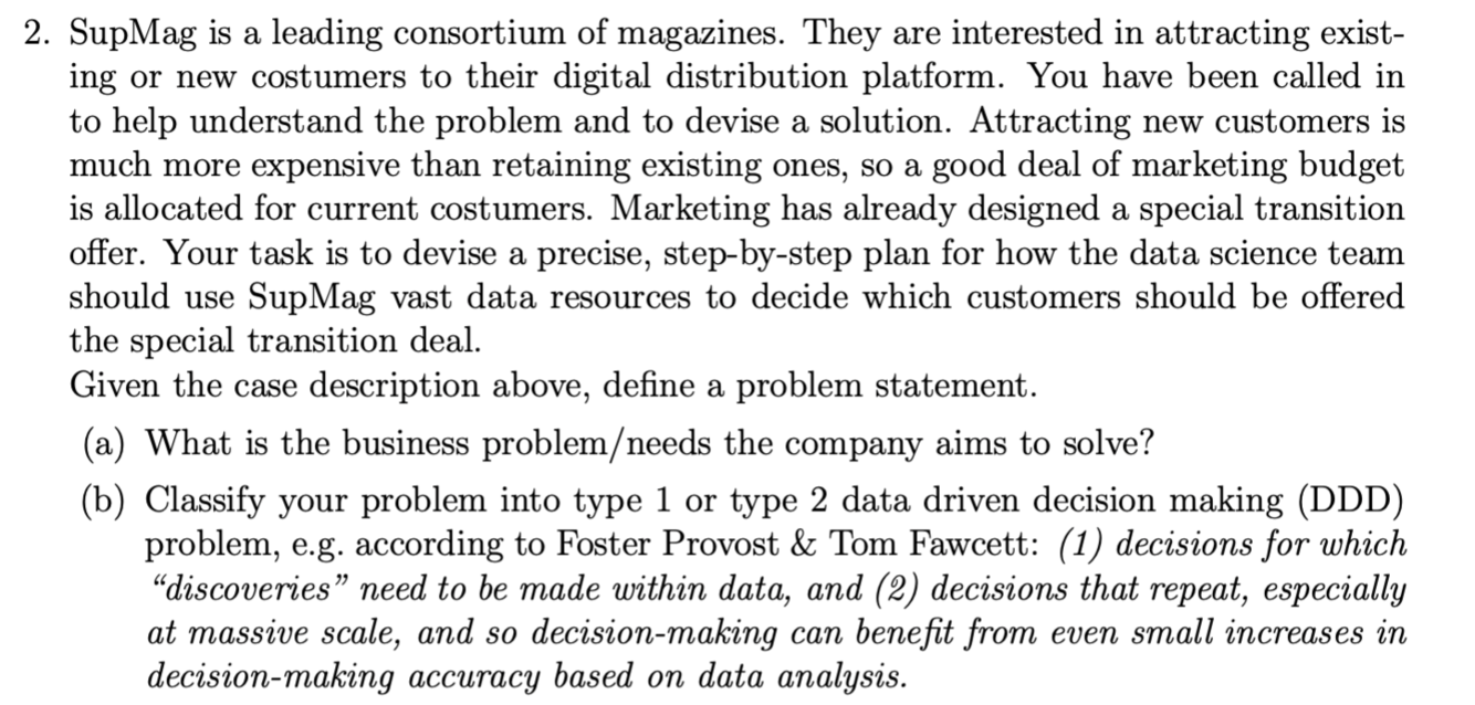 Classify your problem into type 1 or type 2 data driven decision making (DDD)problem, e.g. according to Foster Provost & Tom Fawcett: