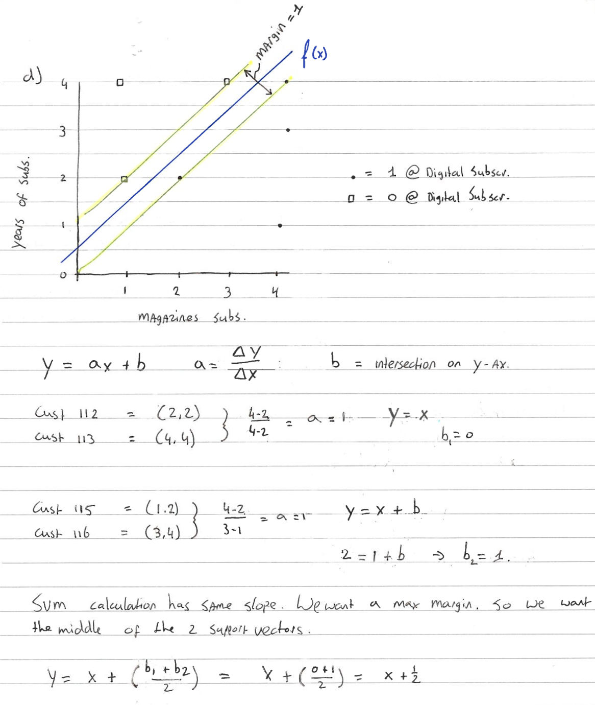 d) You are now provided with yet another smaller dataset, presented in table 2.Sketch the observations and optimal separating hyperplane (including equation),as a maximal margin classifier (or maximum linear classifier). Include on thesketch the margin for the maximal margin hyperplane.