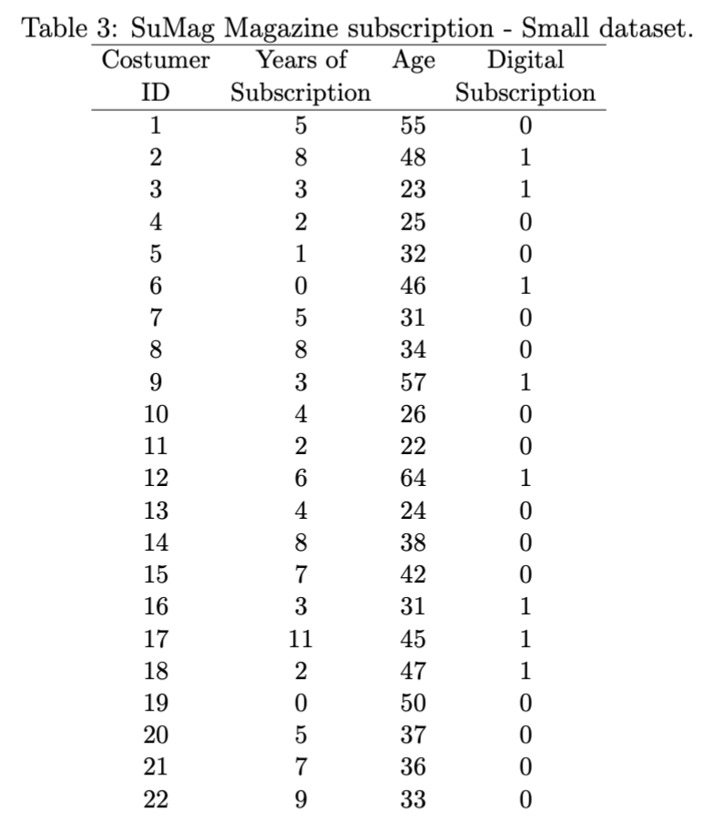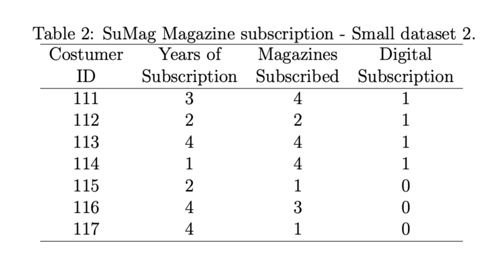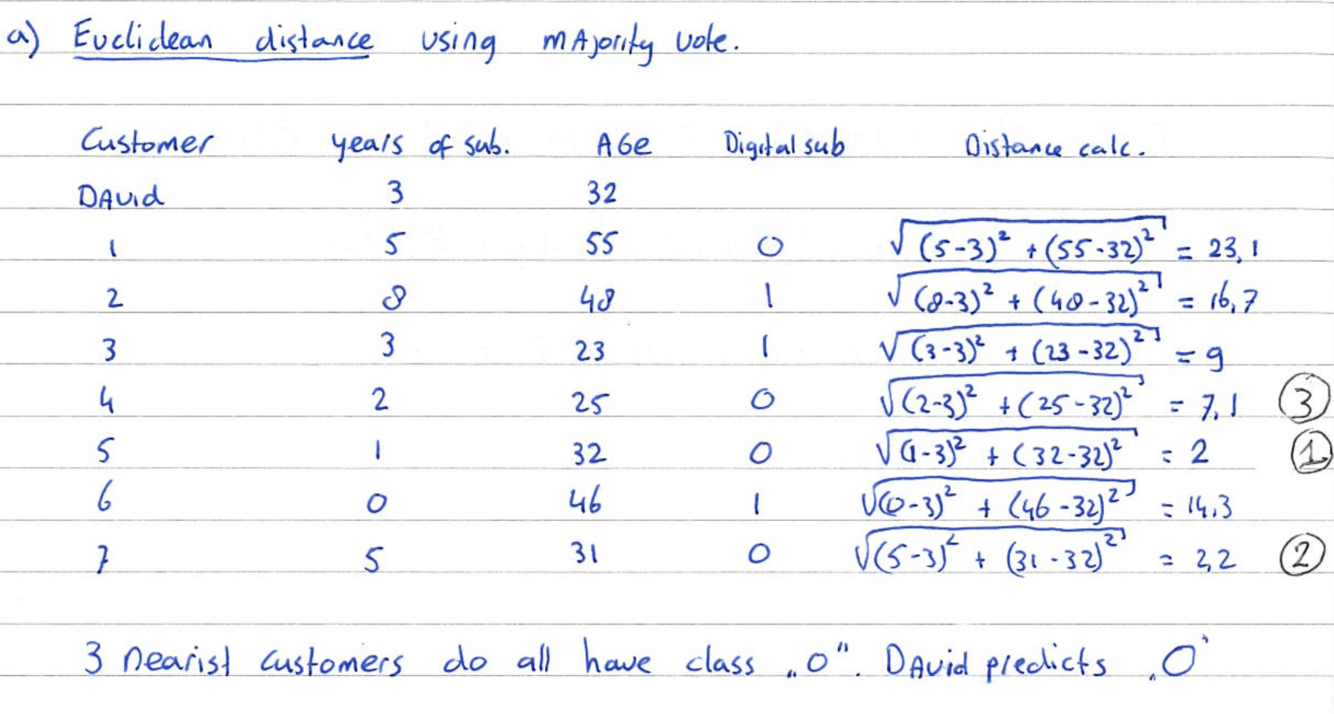 Considering only customers 1 to 7 (inclusive), classify customer David with respectto the three most similar customers using the Euclidean distance and majorityvote. David is 32 years old and has been a subscriber for 3 years.