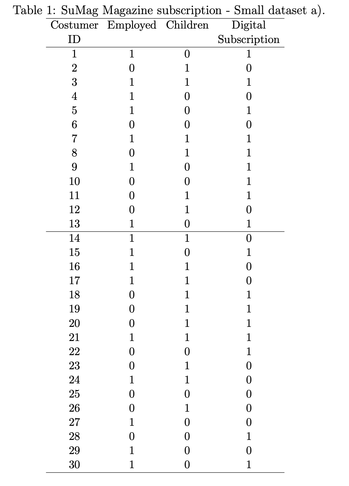 Using only pen and paper, create a probability classification tree dtree 1 using only the variable Employed presented in Table 1. Assuming you use the first 13 customers to train this model and the remaining customers for validation, calculate the accuracy, the confusion matrix, sensitivity and specificity for both the train and validation data. While creating the tree you may find two different possibilities, report them both.