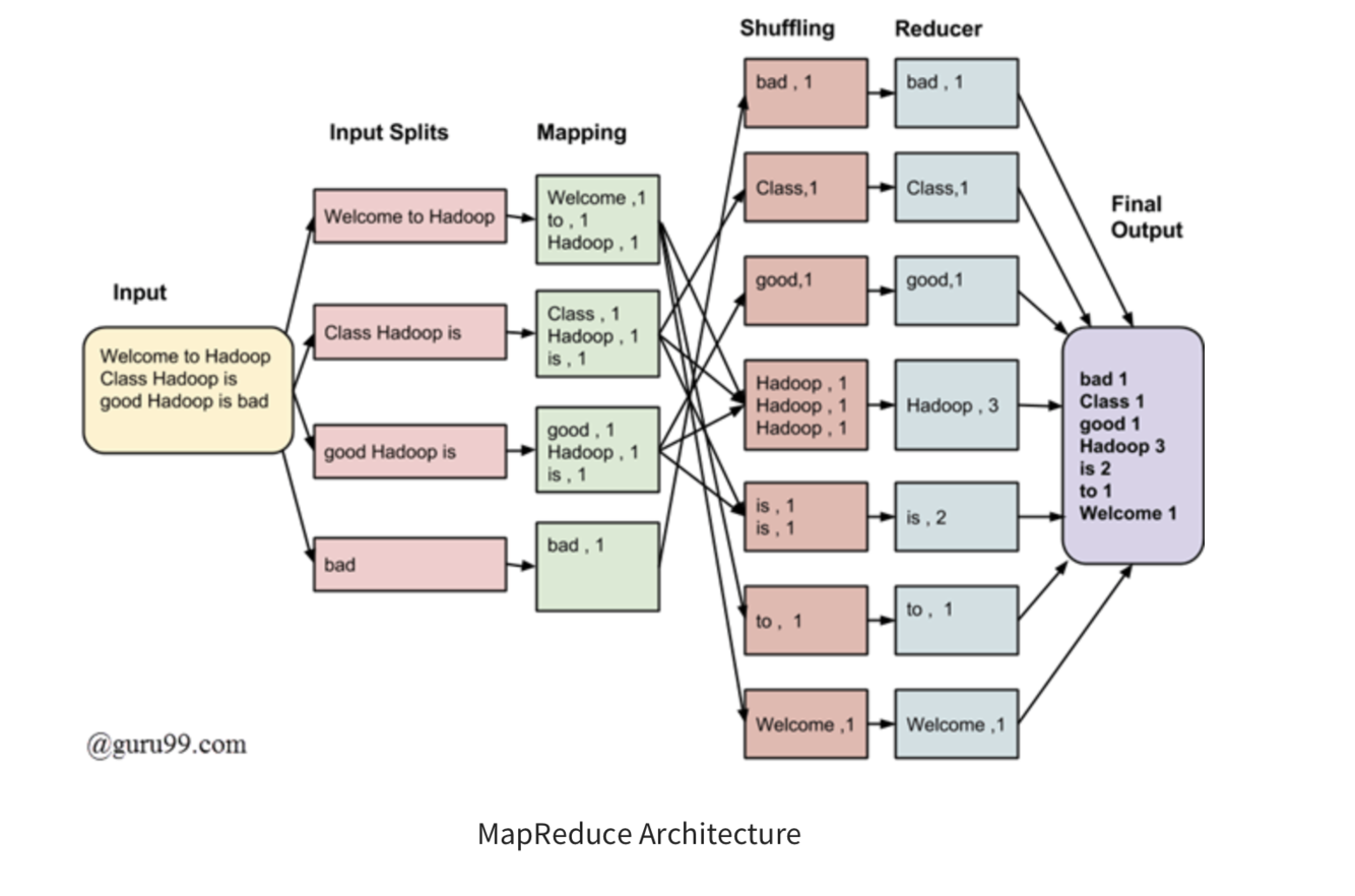 Steps are map, shuffle and reduce to efficiently paralell process lots of data (text or otherwise).