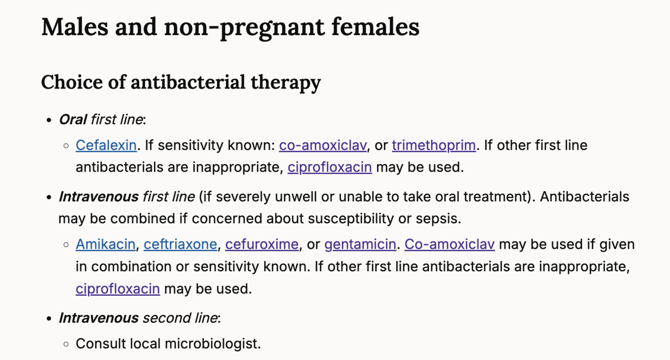 Broad-spectrum cephalosporin: Cefalexin or quinolone: e.g Ciprofloxacin