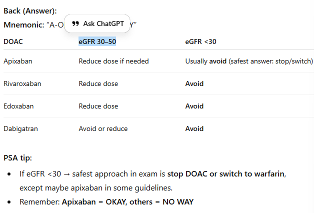If eGFR < 30 → safest approach in exam is stop DOAC or switch to warfarin, except maybe apixaban in some guidelines.