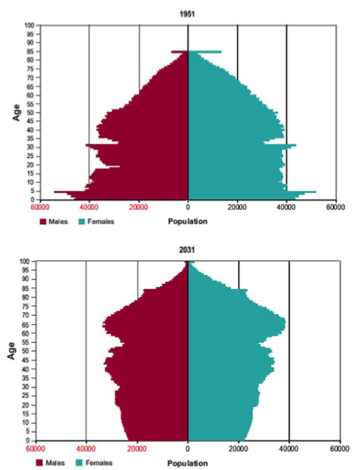 Look at the 2 population pyramids for Scotland between 1951 and 2031.