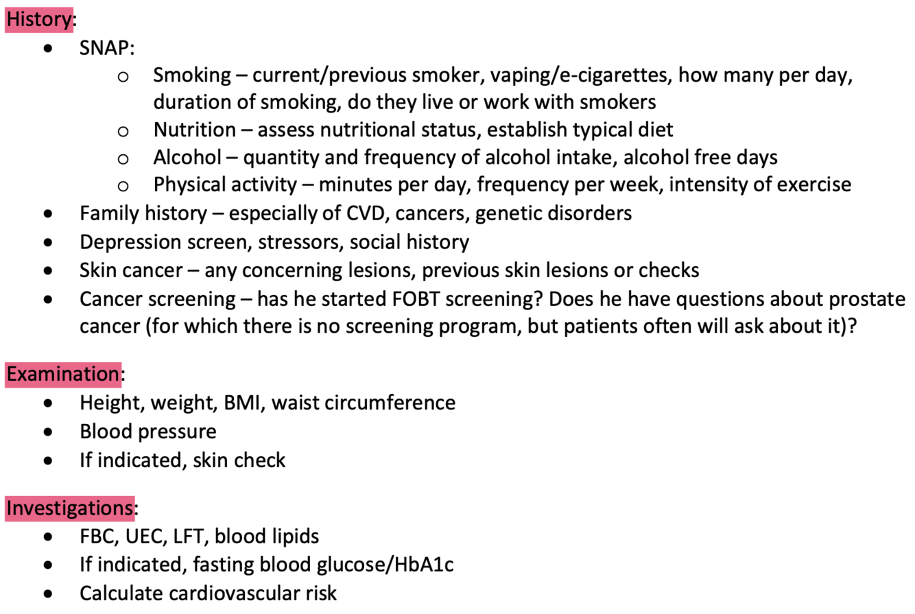 What history and examination should the GP perform, and what investigations would you order for this man? Refer to the RACGP Red Book to guide your answers.
