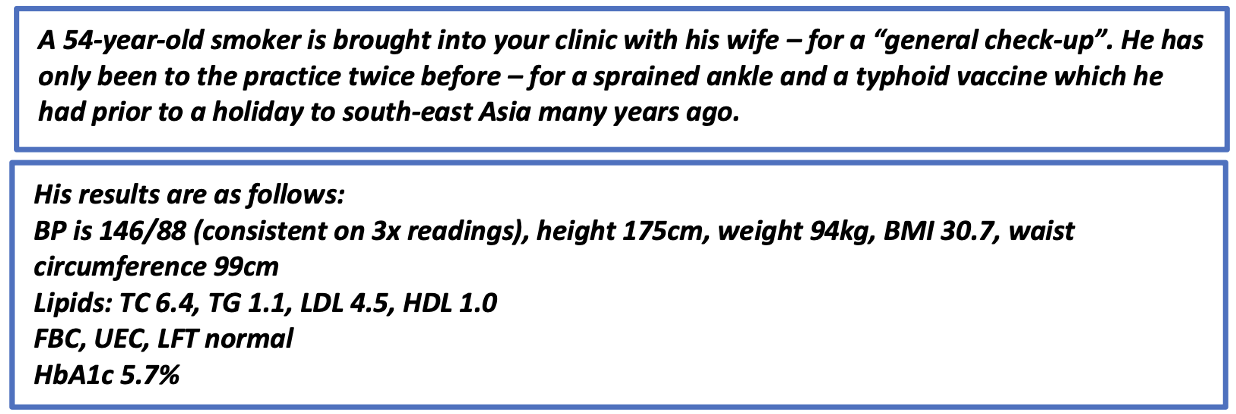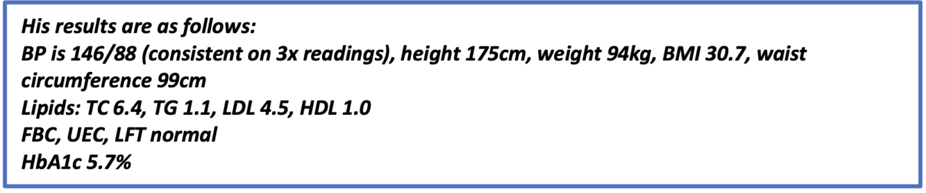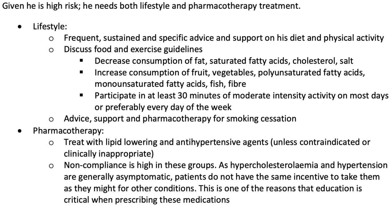 Using the CVD check calculator – his cardiovascular risk is 18%, i.e. high risk.