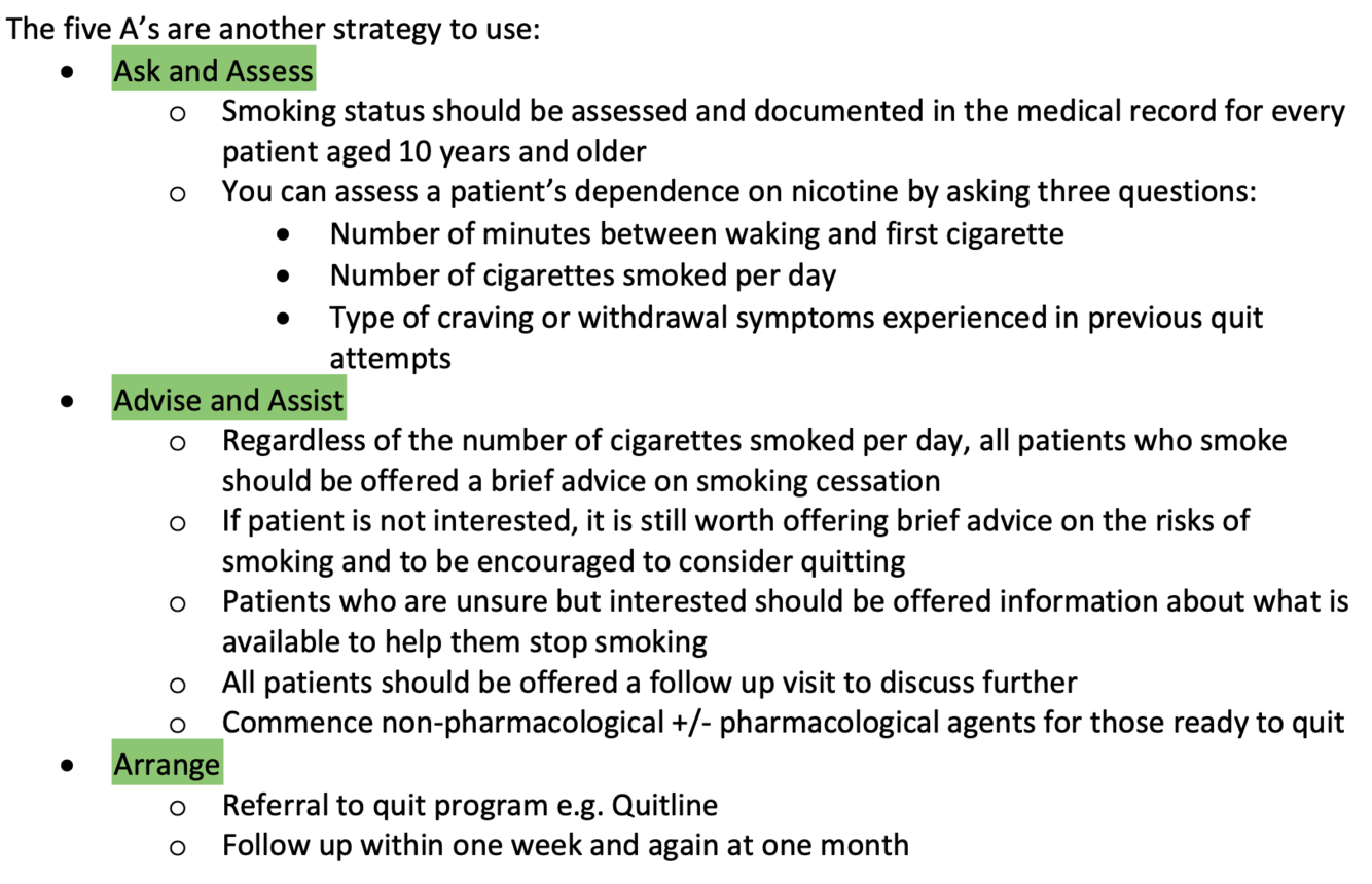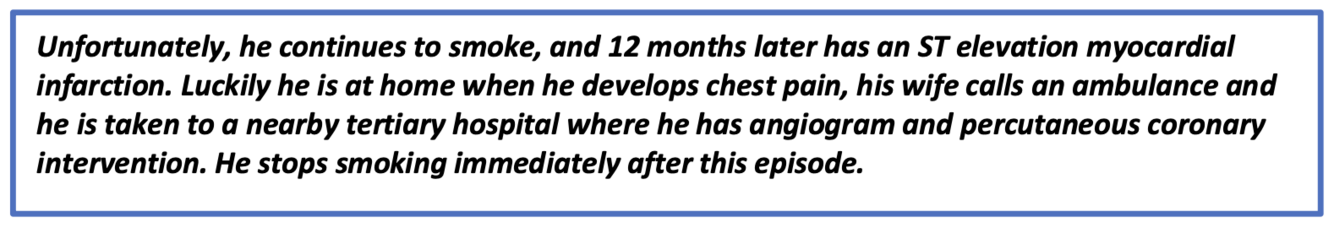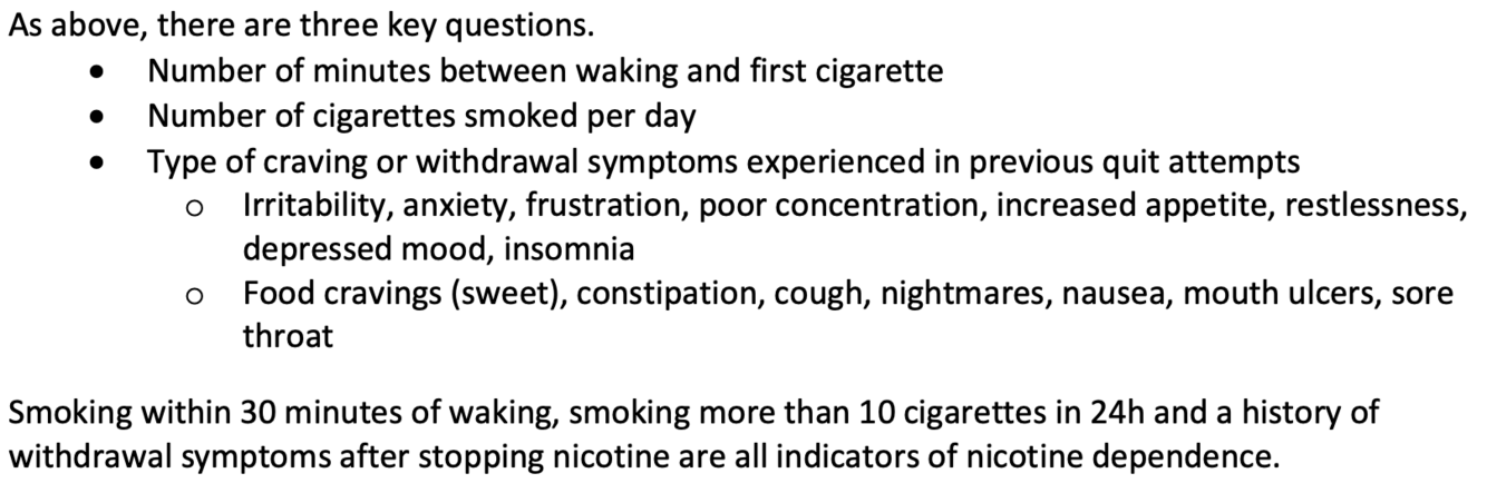 It is worth asking simple questions in a non-judgemental manner such as ‘how do you feel about your smoking’. From their answer, you can generally ascertain a sense of where they are in the Stages of Change Model: precontemplation, contemplation, preparation, maintenance, or relapse. Once you are aware of this, you can tailor appropriate questioning and advice.
