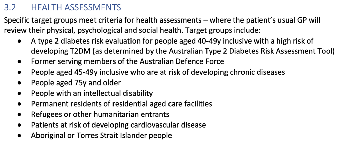 Specific target groups meet criteria for health assessments. List 9 of them.