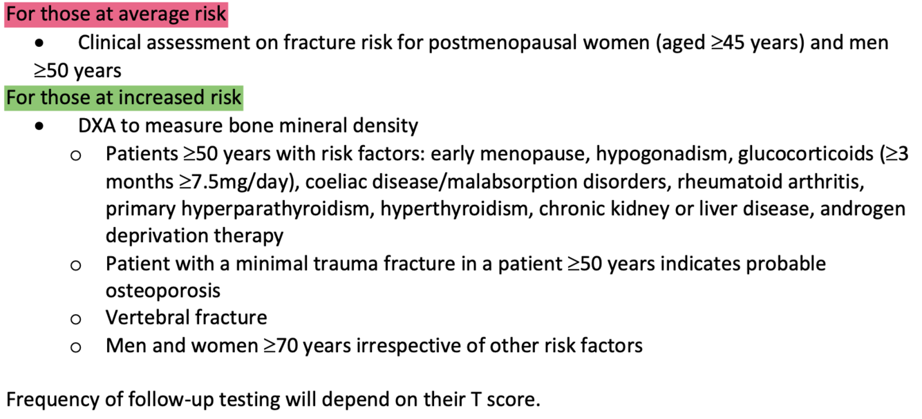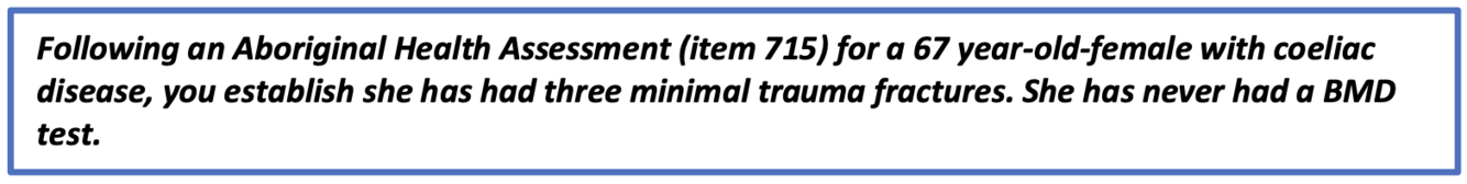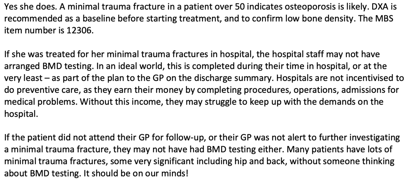Does she qualify for an MBS subsidized BMD scan? Consider reasons why she may not have had a BMD before.