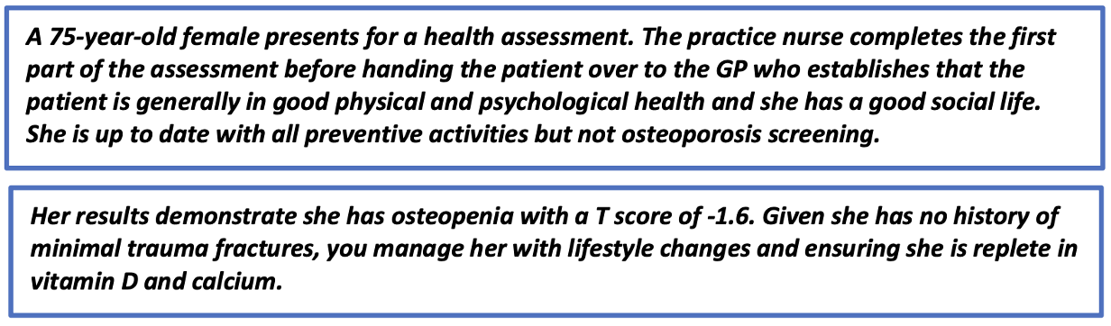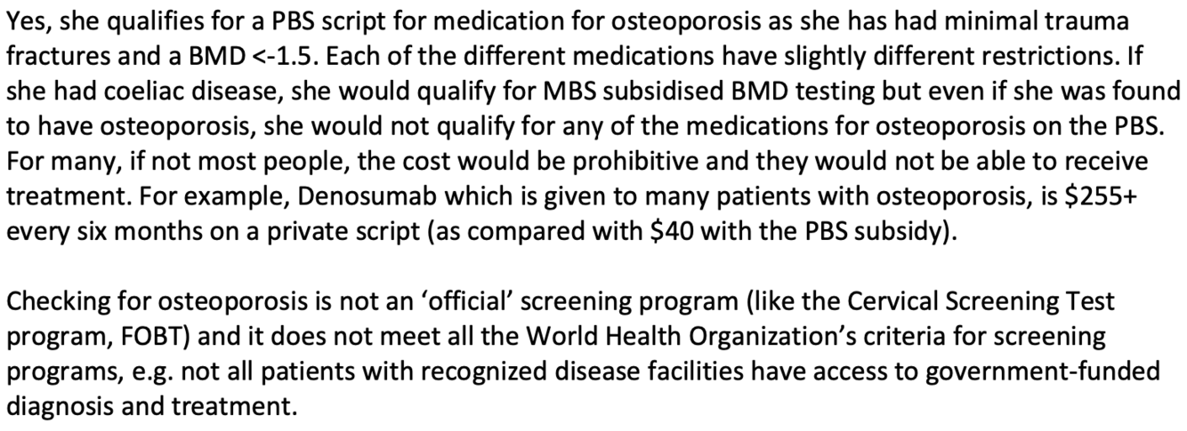 Does she qualify for PBS subsidised medical treatment? If she had not had the minimal trauma fractures, would her options change? Comment on discrepancy between the MBS and PBS guidelines for screening and management of osteoporosis.