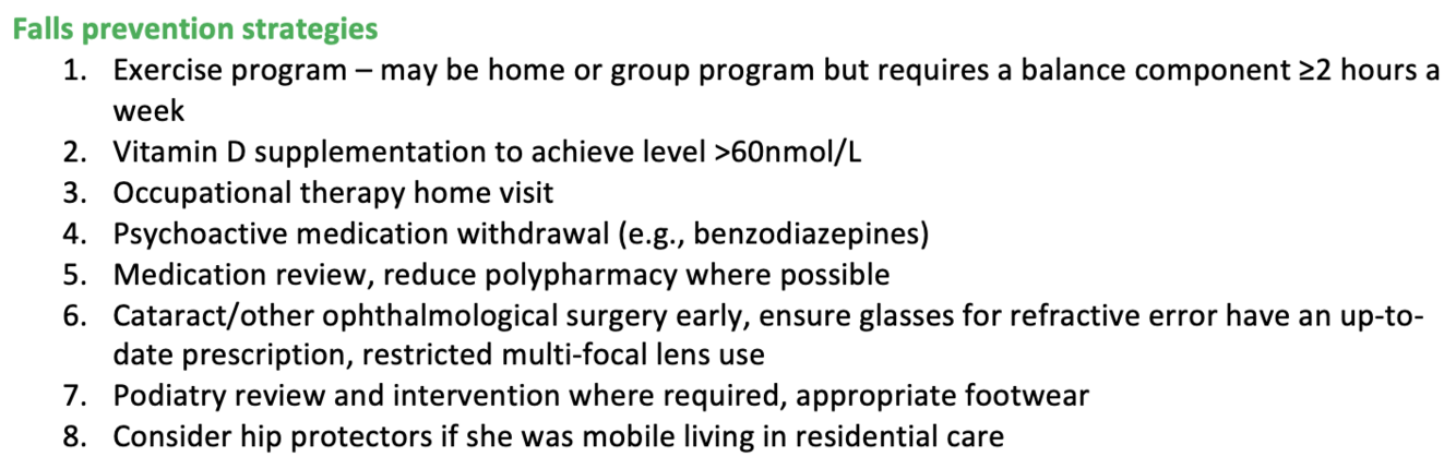 What are 8 evidence based falls prevention strategies that you could implement for this patient?