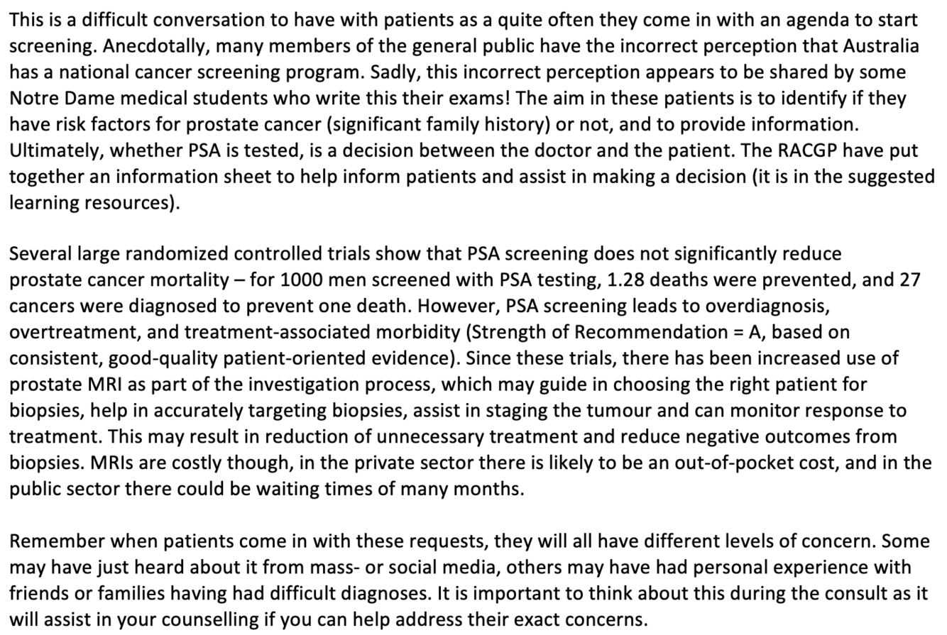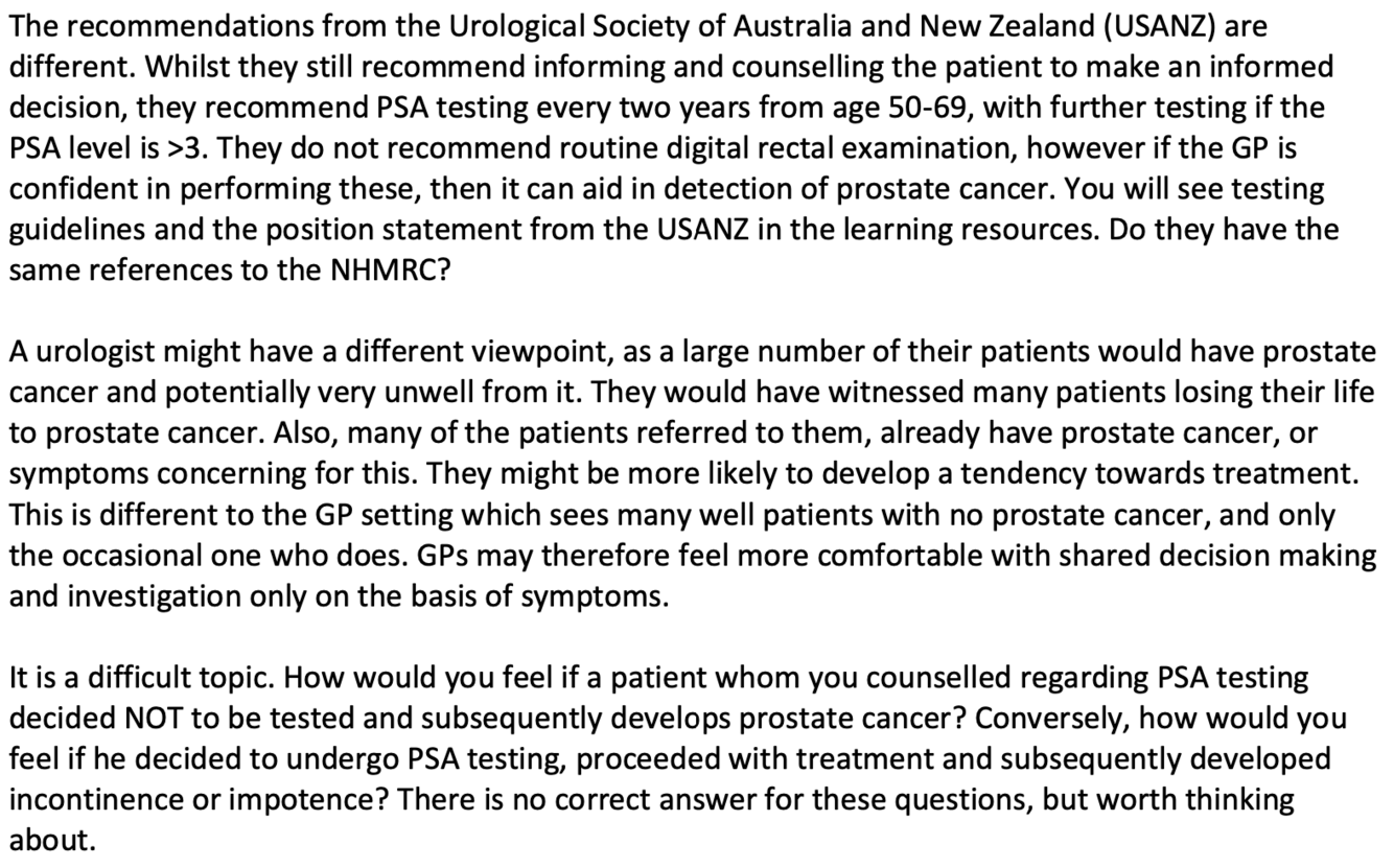 Look at this consult from the view point of a GP and of a urologist? How would it differ? Why do recommendations of the Cochrane Database, NHMRC and RACGP differ from those of the Urological Society of Australia and New Zealand?