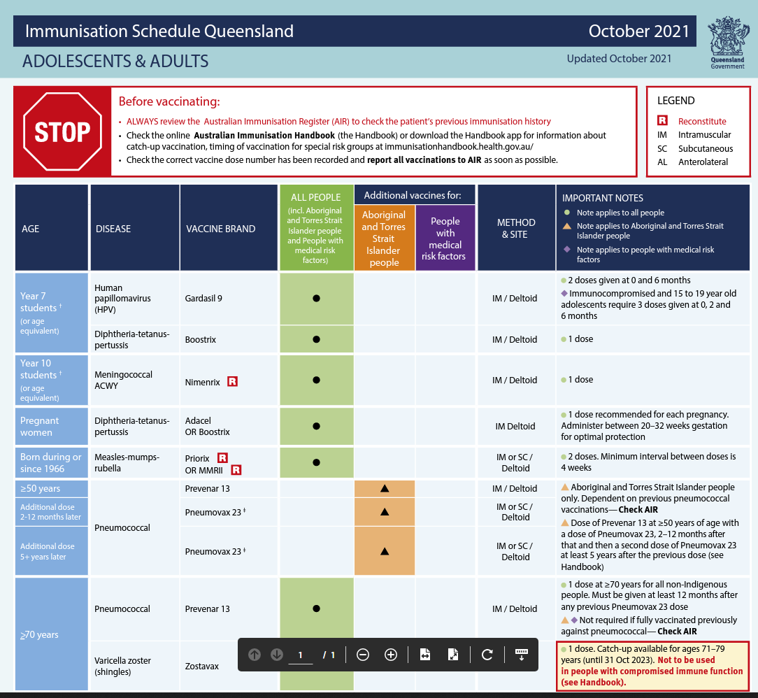 What are Qld Immunisations for adolescents and adults? e.g starting in school