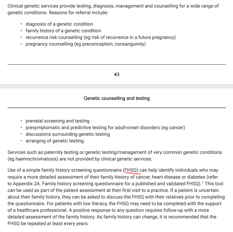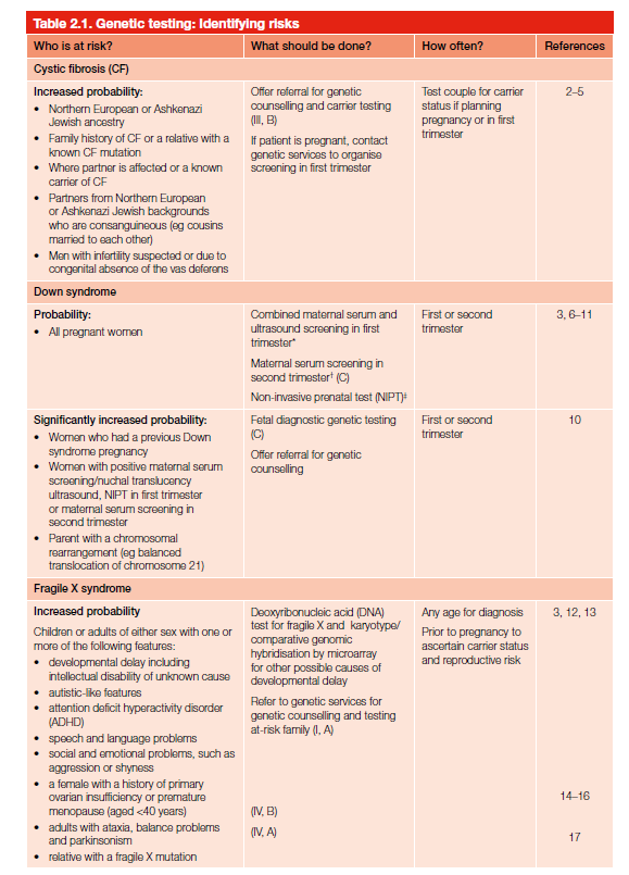 In order to identify patients who may be at risk of a genetic disorder, a comprehensive family history must be taken from all patients, and this should be regularly updated. A family history should include f irst-degree and second-degree relatives on both sides of the family and ethnic background. Age of onset of disease and age of death should be recorded where available.