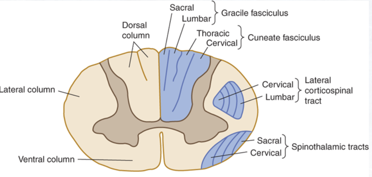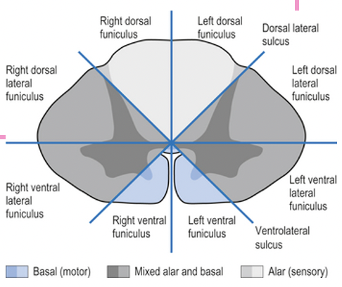 What structures are found within the lateral and ventral funiculi?