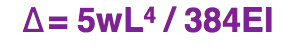 Deflection (∆) = 5 x weight in lbs (w) x length in feet x 12”4 (L4) / 384 x 12” modulus of Elasticity (E) x Moment of Inertia (I)” ∆ = 5wL4 / 384EI
