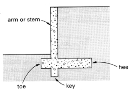 Cantilever wall: resists forces by the weight of the structure & weight of the soil on the heel of base
