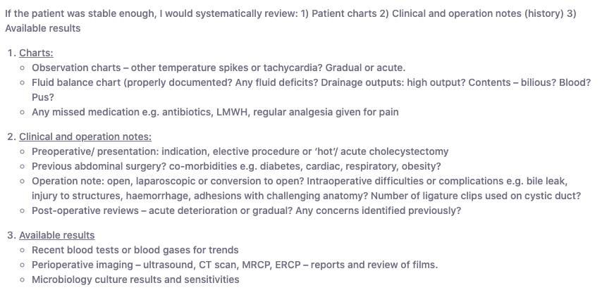 Post operative patient - what would you look at in the notes?