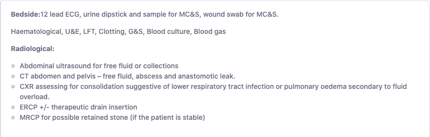 Investigations you would consider for a post operative patient with suspected abdominal sepsis