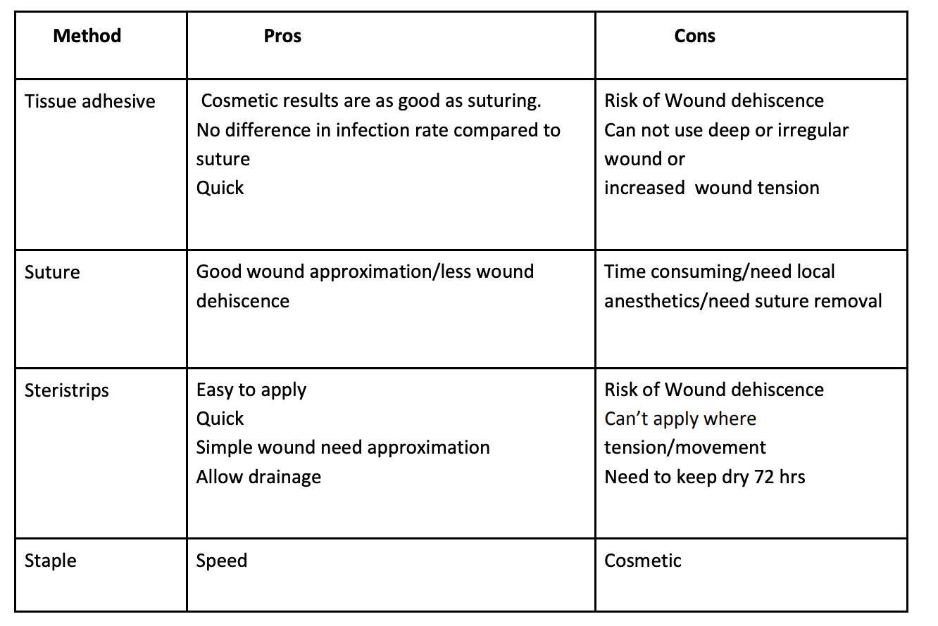 what are the advantages and disadvantages of common methods of wound closure in ED