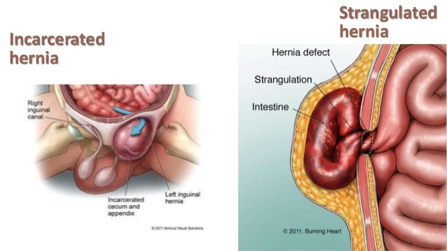 Mechanical intestinal obstruction caused by an incarcerated hernia has the same clinical picture and potential for strangulation as described above, but the PE shows the irreducible hernia that used to be reducible. Because we can effectively eliminate the hernia, all of these undergo surgical repair, but the timing varies:: emergently after proper rehydration in those who appear to be strangulated and electively in those who can be reduced manually and have a viable bowel