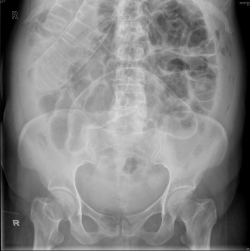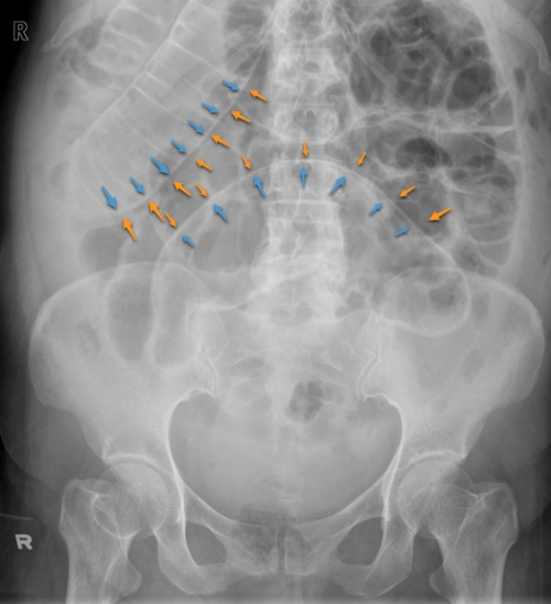 It shows small bowel obstruction (valvulae conniventes) as well as a perforation (Rigler’s sign - you can see the bowel wall on both sides of the lumen).