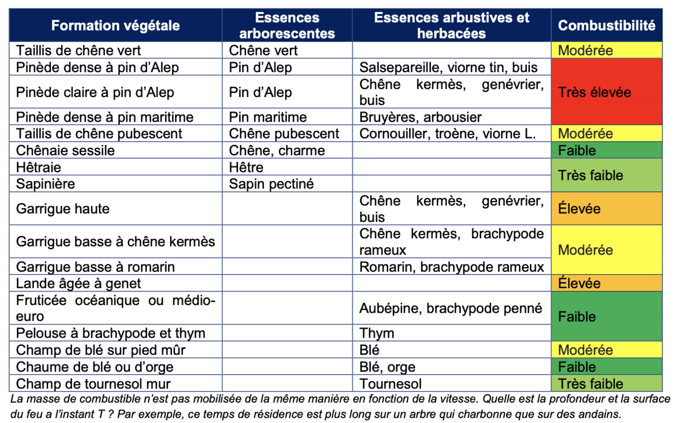 C’est la propriété qu’à un végétal, ou un ensemble de végétaux, à propager le feu. Elle est représenté par le temps de résidence de la flamme.