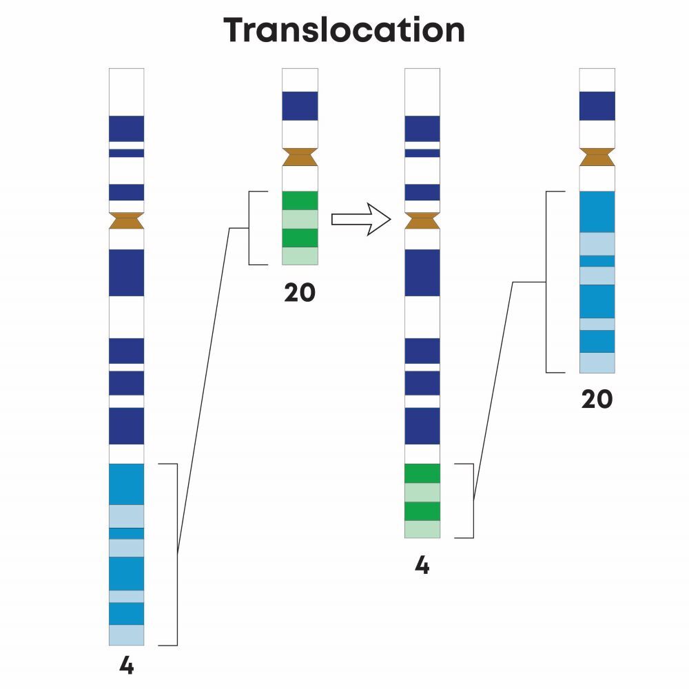 Translocation: occurs when a portion of a chromosome is detached and reattached to another nonhomologous chromosome.