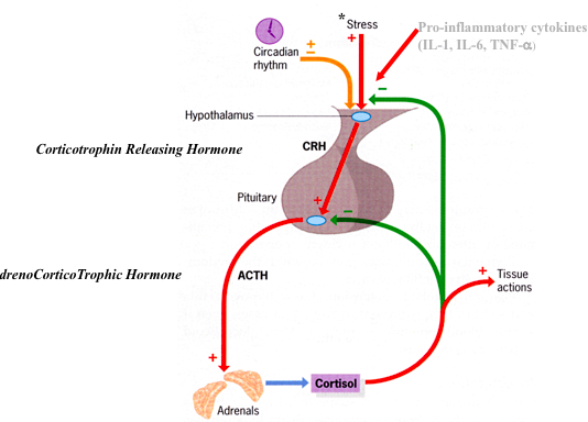 This stimulates the pituitary to release AdrenoCorticoTrophic Hormone (ACTH) –> This causes the adrenals to secrete cortisol