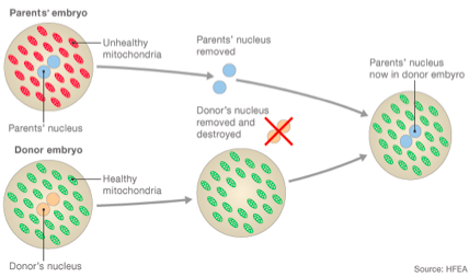 The parents embryo has their nucleus removed, and inserted into a donors embryo that has healthy mitochondria (and no nuclei)