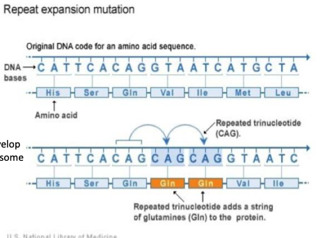 Trinucleotide repeat - repeat for CAG (makes glutamine)