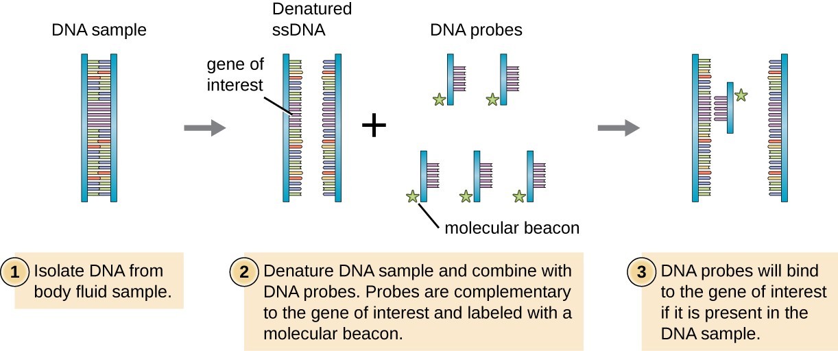 Split two strands of DNA. Add a gene probe (single strand of DNA that is complementary to the specific gene you want to test for). When mix DNA with gene probe if gene probe bonds with DNA then you know that particular gene is present.