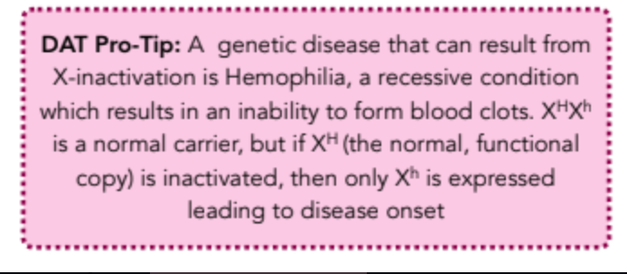 Ex. calico cats - characteristic of black and orange fur depend on which copy of the x chromosome the cell chooses to leave active