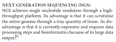 Revolutionised genetic sequencing. Umbrella term many different technologies. Can now sequence an entire human genome in one day (Sanger sequence technique took 30 years). Benefits: cheap, fast, Good for PGT-A (Copy number chromosome counting)
