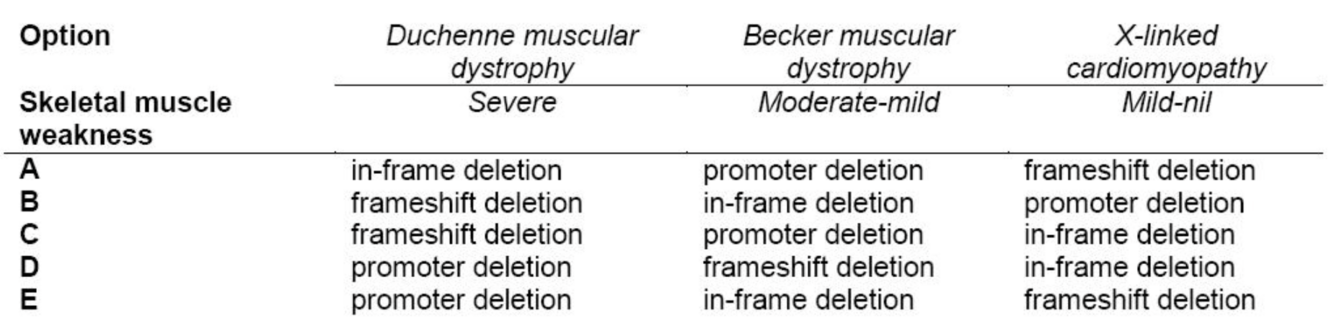 Different mutations in the DMD (Duchenne muscular dystrophy) gene cause three clinically distinct syndromes in males. The table below lists the three conditions, the degree of skeletal muscle weakness, and a number of different abnormal genotypes involving the DMD gene.