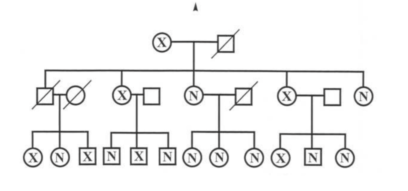 In the pedigree shown, individuals marked with an X have a rare genetic disorder. Those marked with an N are clinically normal. Those with a slash are deceased and the remaining family members have not been examined clinically.