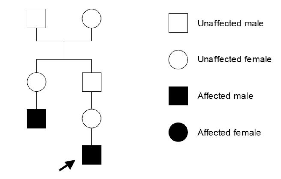 The mutation in the haemochromatosis (HFE) gene is present in approximately 10% of the Caucasian population. The diagram below shows that three men in a family have been diagnosed with haemochromatosis.