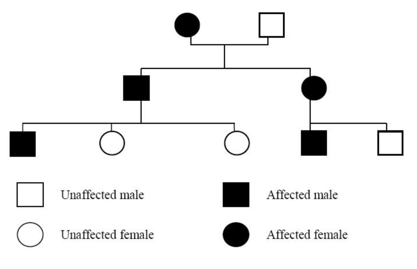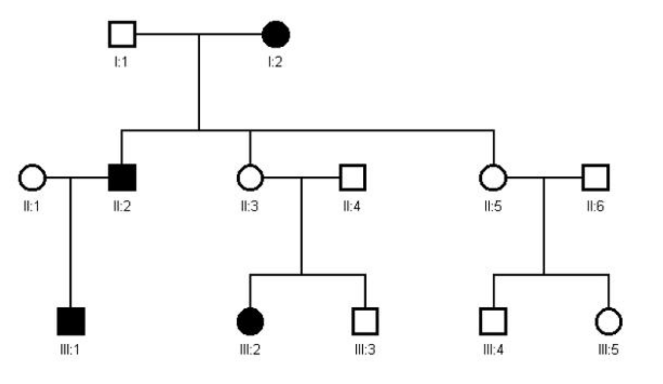 In the above diagram, the mother (I:2) is affected, and yet her daughter (II:3) is not. But despite II:3 not being affected, her daughter in (III:2) is affected.