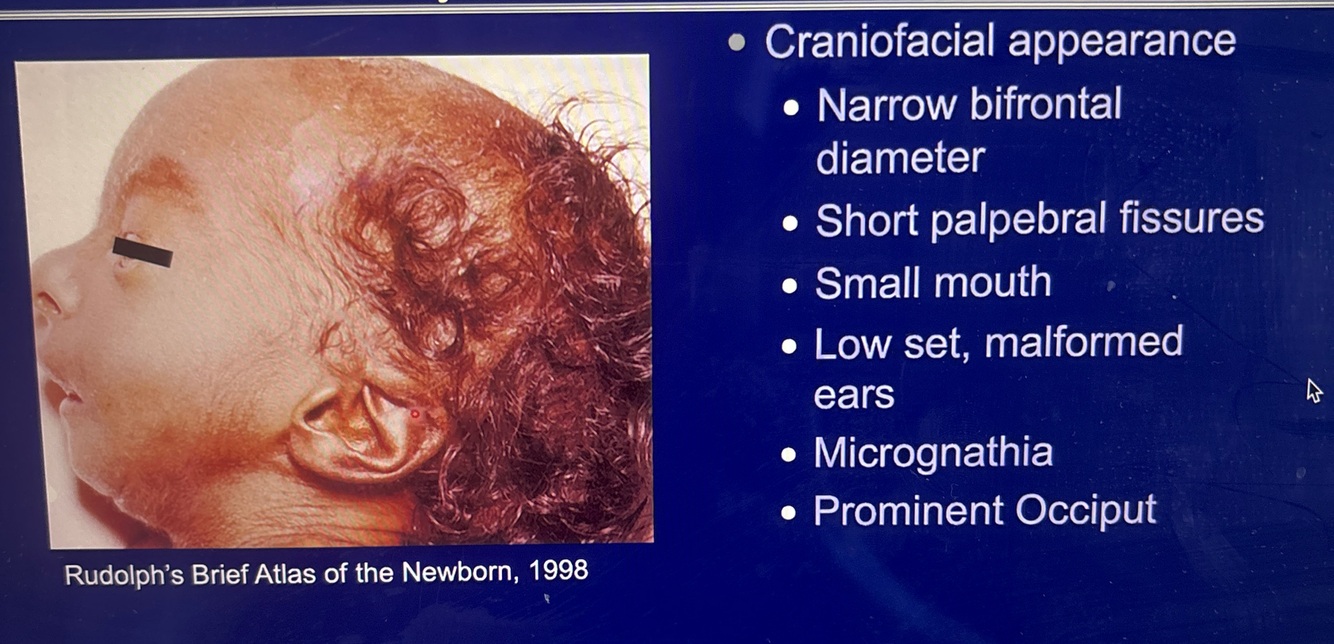 small philtrum, small chin, underdeveloped external genitalia in males, temporal narrowing, epicanthic folds, anteverted nostrils