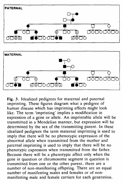 Example: Prader-Willi syndrome. The gene 15q11-q13 is maternally imprinted. Deletion of 15q11-q13 in the paternal chromosome accounts for 75% of cases. Disease occurs because the [normal] maternal copy is silenced.