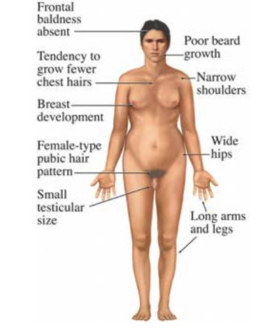 XXY Most common genetic abnormality associated with PRIMARY hypogonadism. Individuals have small external genitalia and tests. 50% will develop breasts. Usually sterile, impaired spermatogenesis elevated levels of FSH and LH
