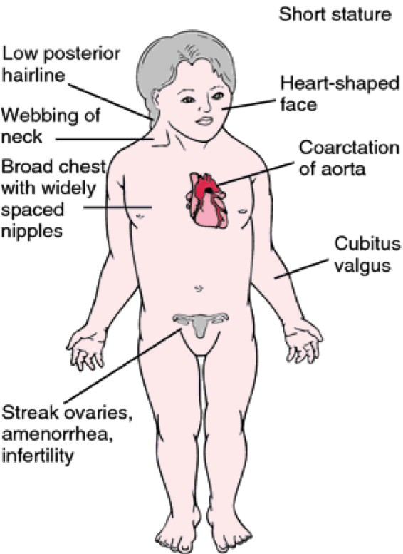 XO Ovum that lacks X fertilized by Sperm with X or Normal ovum (X) fertilized by sperm lacking X or Y. Female appearance but Short, wide chest Prominent neck skin folds Usually sterile, low estrogen Small breasts Normal mental development
