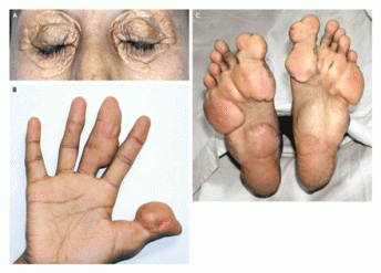 CTG trinucleotide repeat expansion in the DMPK gene, abnormalexpression of myotonin protein kinase, myotonia, muscle wasting, cataracts, testicular atrophy, frontal balding, arrhythmia.